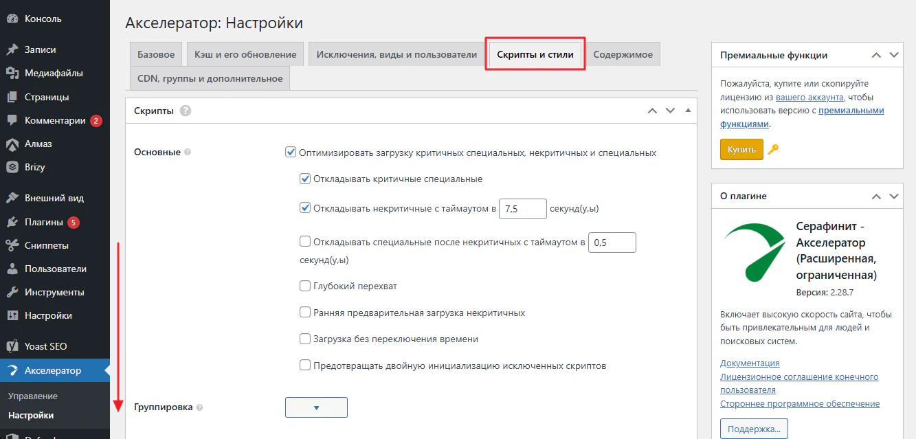 Для получения максимальных баллов в PageSpeed нам нужна расширенная версия плагина Seraphinite Accelerator, обычная версия которая у нас сейчас установлена только кэширует сайт, сайт не оптимизирует для быстрой загрузки.