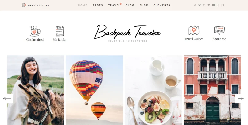 Backpack Traveler — это как ваш цифровой рюкзак: в нем есть всё, что нужно для тревел-блогера. Тематические шаблоны направлений, сетки для отображения фотографий и интеграции с соцсетями. Очень гибкий в плане дизайна и настроек.