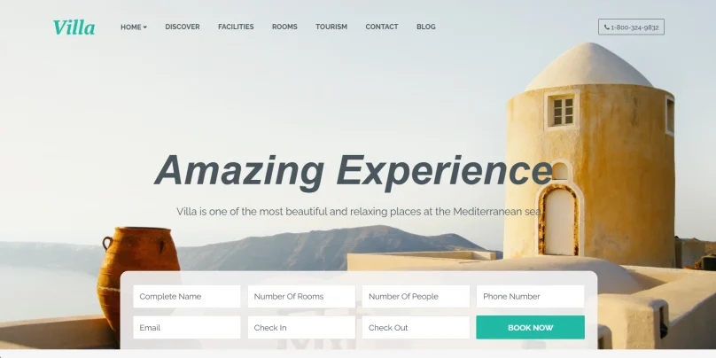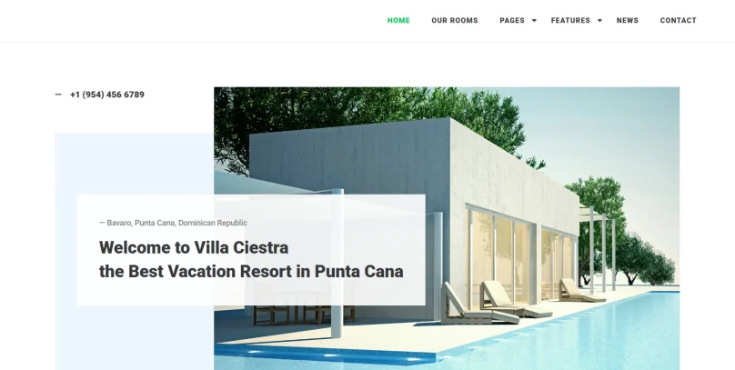 Подойдёт для вилл, пансионатов или курортов. Удобная галерея, блоки отзывов и встроенный плагин бронирования MotoPress. Всё красиво и понятно
