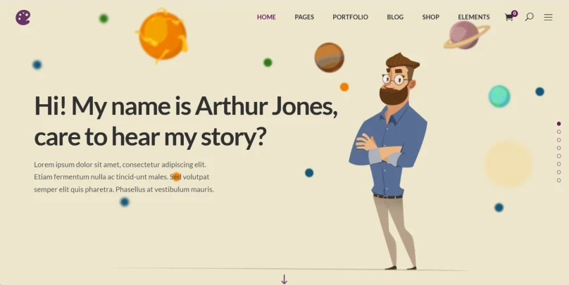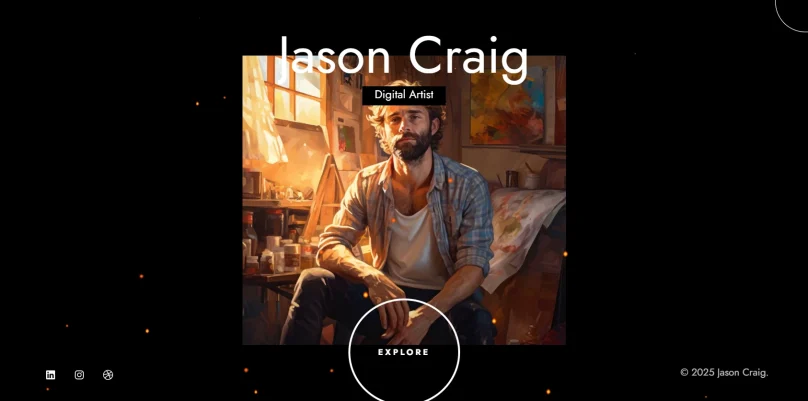 Яркий шаблон с акцентом на мультимедийную презентацию. Включает предустановленные шаблоны для сторителлинга, выставок и игровых приложений. Подходит для художников и креативных брендов.