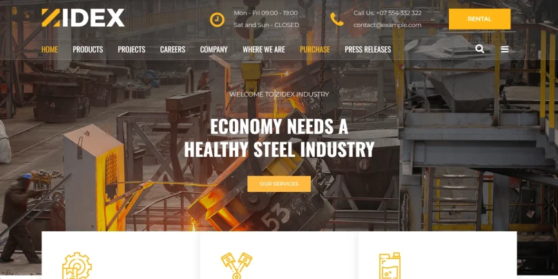 Zidex — это шаблон с акцентом на промышленный дизайн и инженерные решения. Подходит для создания сайта с каталогом услуг и товаров, а также блогом с отраслевыми новостями и публикациями.
