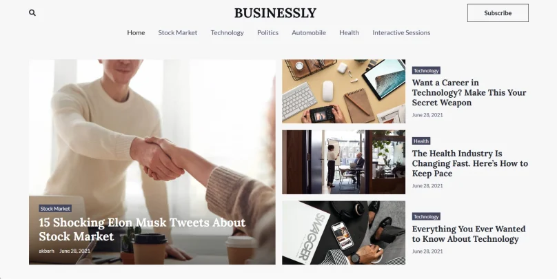 Простой и адаптивный шаблон для новостных порталов и онлайн-журналов. Построен на Elementor и Bootstrap.